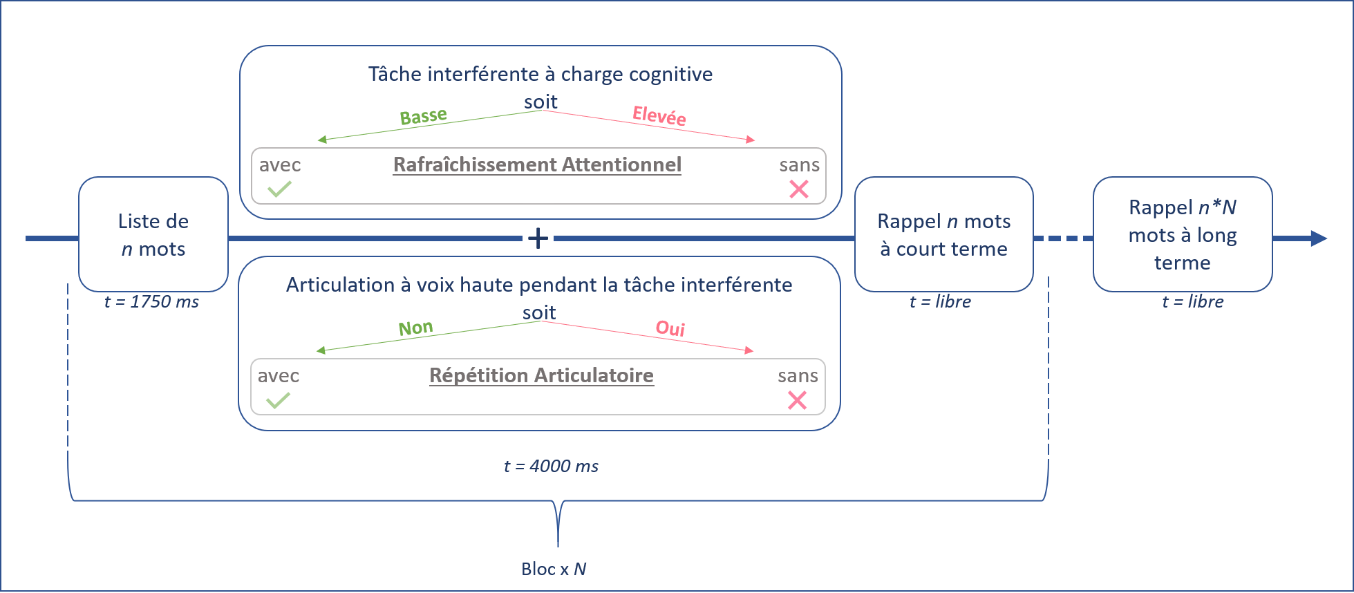 Afin de tester nos hypothèses nous manipulerons la disponibilité des mécanismes de mémoire de travail. La disponibilité du rafraîchissement attentionnel sera manipulée par le biais d’une tâche interférente soit à charge cognitive élevée, afin de bloquer ce mécanisme, ou à charge cognitive faible dans le cas contraire. En même temps, la disponibilité de la répétition articulatoire sera manipulée en demandant, ou pas, au participant de répéter des syllabes à voix haute, afin de bloquer ou pas ce mécanisme. Une fois la tâche interférente finie, le participant procédera à la phase de rappel à court terme puis à celle de rappel à long terme. La figure 1 illustre la procédure que nous utiliserons.