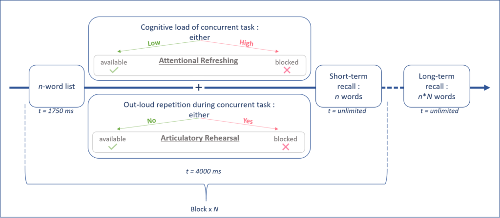 In order to test our hypotheses, we will manipulate the availability of both working memory mechanisms previously described: articulatory rehearsal and attentional refreshing. The availability of attentional refreshing will be manipulated using a concurrent task. This concurrent task will either be a low cognitive demand task in order to allow the use of the memory mechanism, or a high cognitive demand task to block it. As for articulatory rehearsal, we will either give no particular instruction to participants in order to allow this mechanism during the concurrent task, or instruct them to repeat a set of 3 syllables out loud during the concurrent task in order to block the use of the mechanism. Once the concurrent task is over, the participant will be asked to recall the words from the main memory task at short-term and then later at long-term. (See Figure 1.)